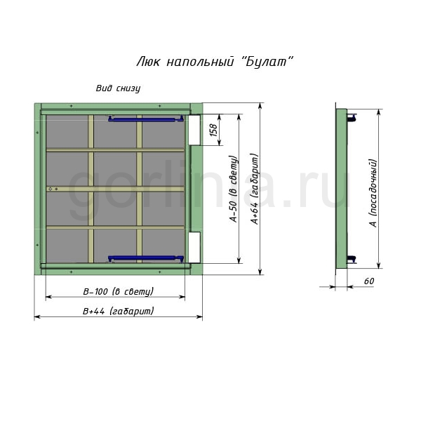 Облегченная рама из листового проката 3 мм с наличником, монтажная глубина 60, в зоне механизма 107 мм. Каркас полотна с обвязкой сварен из трубы 30х20, заполнен ГВЛ под чистовую отделку.