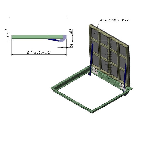 Облегченная модель в заказном размере без щелей в полу с уведенными за ось открывания петлями по длине 700. Легкая ходовая часть и удобная установка. При формировании конфигурации напольного отверстия обратите внимание, что защитные кожухи шарниров выходят за посадочную отметку по плечевой стороне 600.
